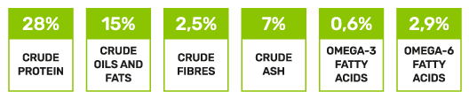 Dehydrated poultry protein (20% Chicken); Wheat; Maize; Rice (4%) Poultry fats; Pea (4%): Rice (4%); Extruded Flax Seeds (4%); Hydrolysed poultry protein; Beet pulp (2%); Minerals (0,7% Sodium Tripolyphosphate); Yeasts (sources of MOS 460 mg/kg), Yucca Schidigera (125mg/kg).
